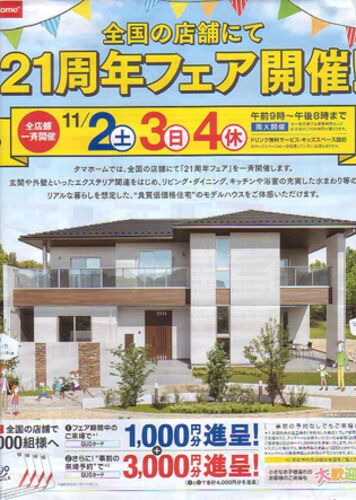 タマホーム酒田営業所 増税後も1,200万円台~。 (11月末まで333棟) 11/2土・3日・4休 午前9時~午後8時まで、雨天開催。 クオカード進呈 フェア期間中のご来場で1.000円分 事前の来場予約で3.000円分をさらに進呈 0120-923-000 タマホーム 山形県庄内地域…