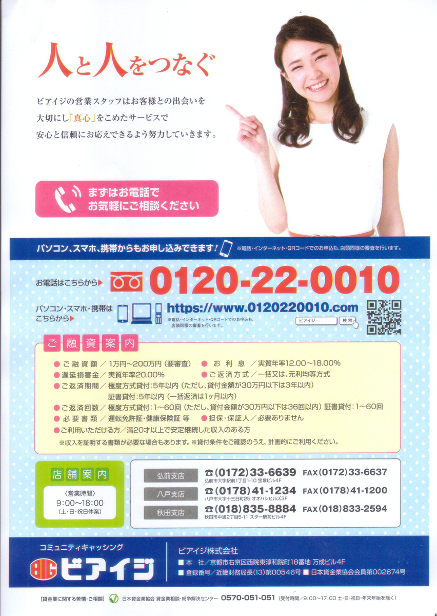 2022-10-24 ビアイジ株式会社 「真心」をこめたサービス お気軽にお電話ください。 フリーダイヤル0120-22-0010 コミュニティキャッシング 山形県鶴岡市酒田市へのチラシのポスティングは 株式会社 遊眠工房 山形県鶴岡市 http://beauty.tyo.ne.jp/po.html 「全国のポスティング情報は」 https://www.posting-nippon.com